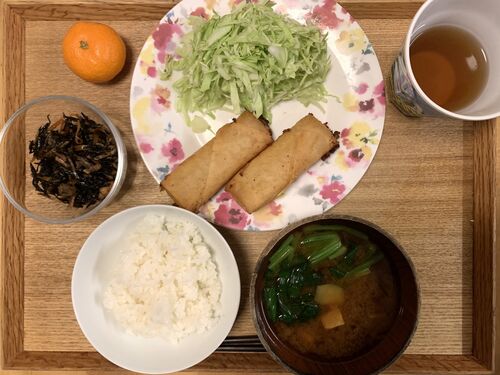 【朝食】ちりめんじゃことジャガイモのふりかけご飯・卵焼き 【昼食】小学校の給食 【夕食】春巻き