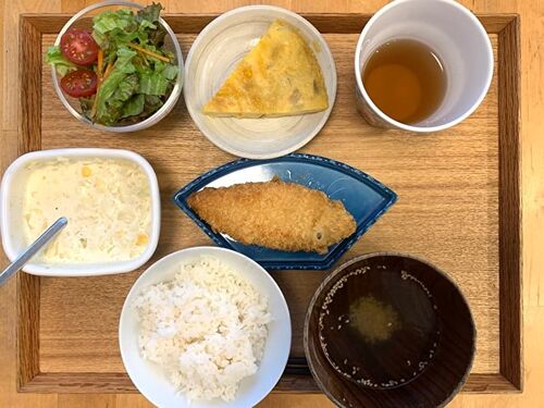 ~今日のメニュー~ 【朝食】ウインナー 【昼食】給食 【夕食】白身魚のフライ・スパニッシュオムレツ 【補食】おにぎり1個・ジュニアプロテイン2杯