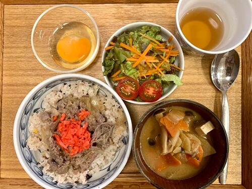 ~今日のメニュー~ 【朝食】目玉焼き・ちくわとキュウリの柚子ポン酢和え 【昼食】給食 【夕食】牛丼・サラダ 【補食】プロテイン2杯・おにぎり1個