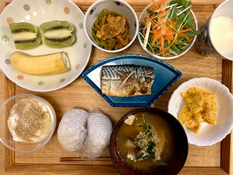 【朝食】焼き魚(サバ)・牛肉とニンニクの芽の炒め物
